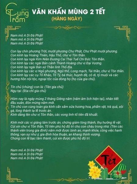 Mùng 2 Tết là ngày quan trọng trong chuỗi nghi lễ đầu xuân của người Việt, khi con cháu tiếp tục dâng hương tưởng nhớ tổ tiên, chư vị thần linh và cầu nguyện cho một năm mới bình an, tài lộc, gia đạo hanh thông. Trong đó, văn khấn cúng mùng 2 Tết đóng vai trò như lời trình bày tâm nguyện, thể hiện lòng thành kính và đạo hiếu của gia chủ đối với cội nguồn. Chuẩn bị bài khấn đúng nghi thức, lời lẽ trang nghiêm không chỉ giúp buổi lễ diễn ra trọn vẹn, mà còn mang ý nghĩa tâm linh sâu sắc trong những ngày đầu năm. Hãy cùng Cung Trầm Gallery tìm hiểu chi tiết về nghi lễ cúng mùng 2 Tết và bài văn khấn chuẩn phong tục, giúp gia đình đón trọn phước lành, may mắn suốt cả năm.