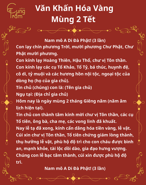 Hóa vàng mùng 2 Tết là nghi lễ quan trọng trong phong tục ngày Tết cổ truyền. Dưới đây là bài văn khấn hóa vàng mùng 2 Tết để gia chủ tham khảo và thực hiện đúng nghi lễ, thể hiện lòng thành kính với Tổ tiên: