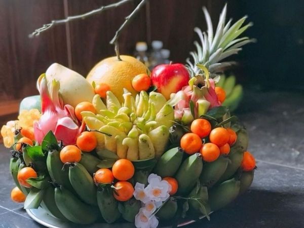 Các loại quả khác: Một số quả như cam, quýt, quất, hồng, táo,... sẽ được bày trí thêm xung quanh, cái cắm vào những khoảng trống, tạo nên sự sum suê và đủ màu sắc theo Ngũ hành.