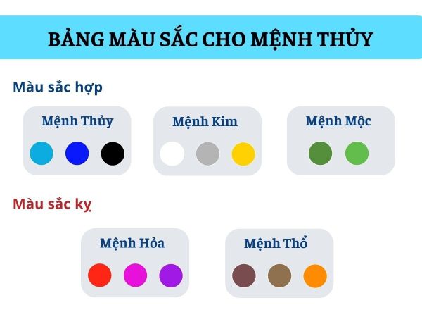 Màu bản mệnh: Là các màu thuộc hành Thủy, bao gồm đen, xanh nước biển, xanh dương,... Sử dụng các màu này sẽ giúp củng cố nội lực và giữ tâm trí luôn thông suốt.